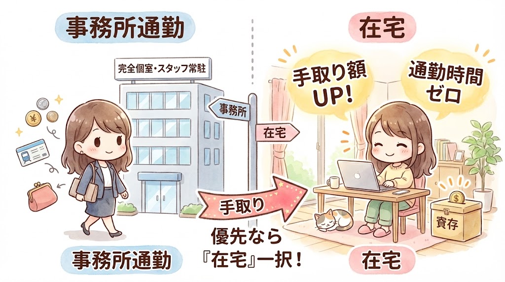 - 事務所に取られる高い「マージン(手数料)」 一等地にある事務所は家賃やスタッフの人件費がかかっているため、あなたが稼いだ報酬から**約30%〜50%もの手数料(マージン)**が引かれてしまうシステムになっています。